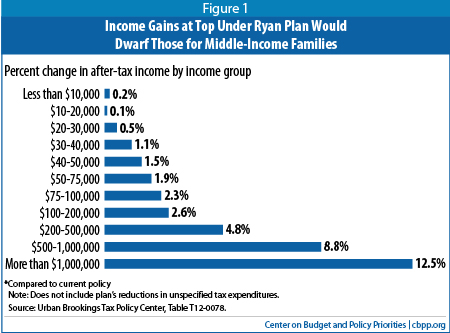 A report recently released by the nonpartisan Center on Budget and Policy Priorities (CBPP) shows that people with incomes above $1 million would receive an average annual benefit of $265,000 from the Ryan tax cuts alone – not counting what they would also receive from the budget’s plan to make the Bush tax cuts permanent. Middle-income taxpayers – those with incomes between $50,000 and $75,000 – would receive $1,045, on average. The report explains that the best gauge of the distributional impact of a tax cut is the percentage changes that it causes in the after-tax incomes of households at different income levels. A progressive tax cut raises after-tax incomes by a greater percentage among lower- and middle-income people than among higher-income people. A regressive tax cut provides a larger percentage of after-tax income gain at the top of the income scale and thereby widens income inequality.