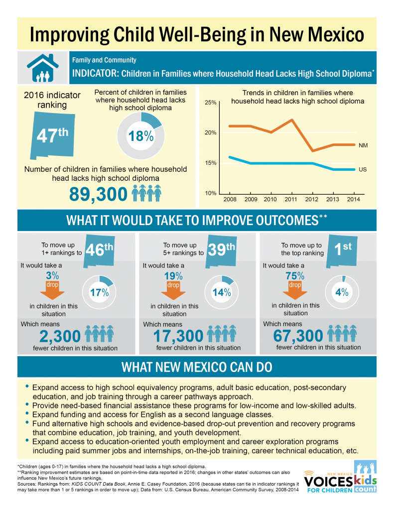 With that in mind, and with support from the W.K. Kellogg Foundation, we researched the potential for positive change in each of the 16 indicators of the KIDS COUNT index with the intent of improving opportunities for New Mexico’s children. We looked at how far away we were from other states on each measure. We identified areas where NM has the greatest opportunities for improvement, where positive change was most attainable and accessible, where we were closest to improving not just our indicator rankings, but more importantly, our outcomes, and how we could do it. Because each KIDS COUNT indicator is closely linked to long-term family and childhood well-being and opportunity, improving outcomes in even one indicator will benefit vulnerable children and increase their probability for success.